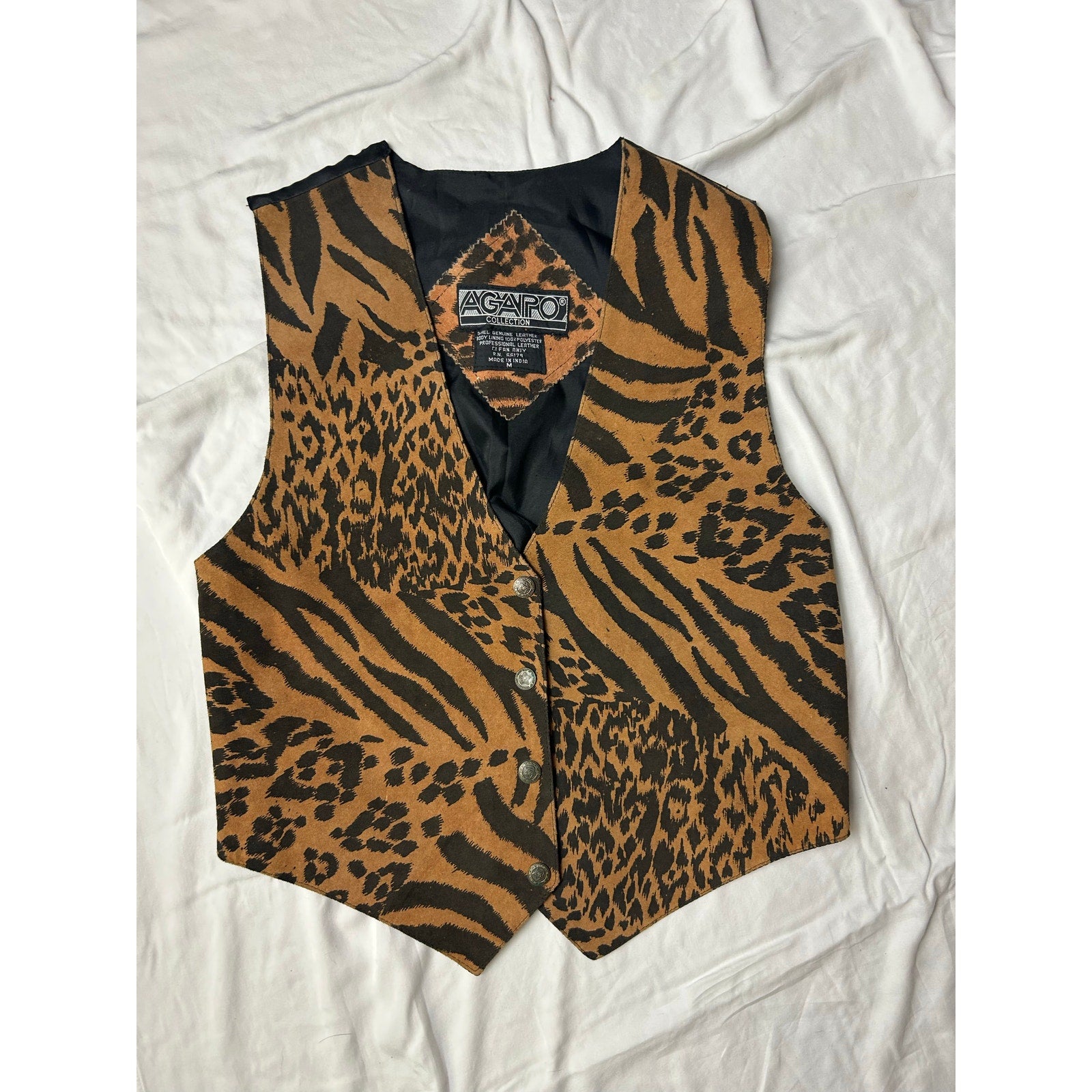 Step back in time with this absolutely fantastic vintage 1980s Agapo leopard print leather vest! This isn't just a piece of clothing; it's a statement, bursting with incredible rock-and-roll energy. Imagine the stories this vest could tell from its days gracing a vibrant 80s rock concert – it definitely has some wild memories embedded within its stylish seams! Crafted from genuine leather, this vest features a bold and iconic leopard print that never goes out of style. It's the perfect layering piece to add an edgy, retro flair to any outfit, whether you're heading to a concert, a themed party, or simply want to elevate your everyday look with a touch of vintage cool. Its timeless design ensures it remains a showstopper. This piece is ready to create new memories with you! Don't miss the chance to own a truly unique garment that exudes confidence and undeniable charm. Grab this opportunity to add a slice of authentic 80s fashion history to your wardrobe. You'll love the way it makes you feel!