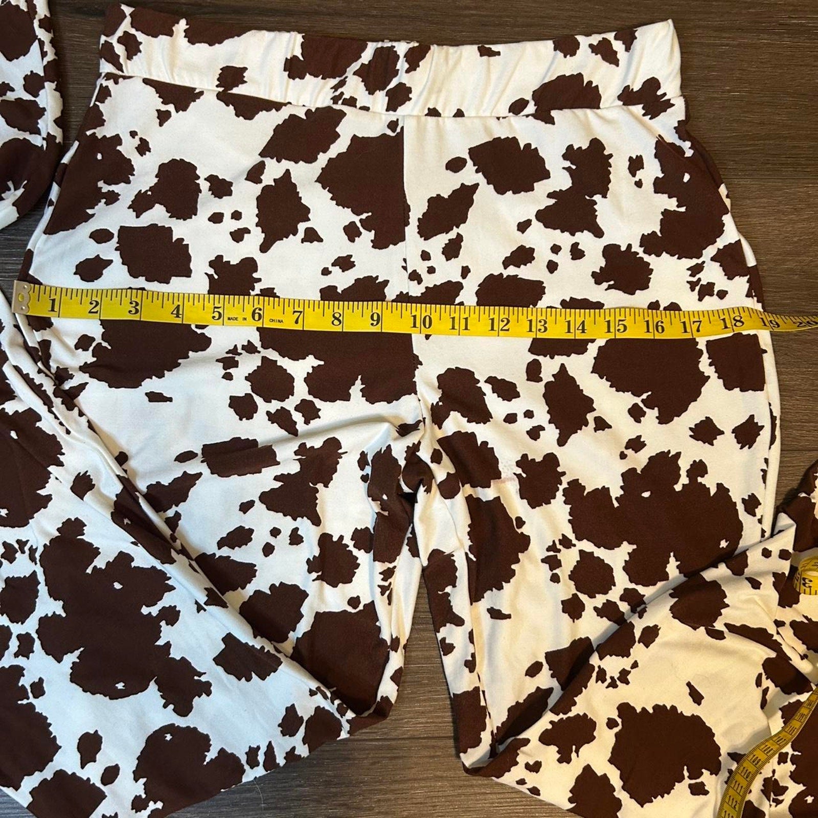 Brown and white cow print flare pants has a spot that needs oxi cleaned
