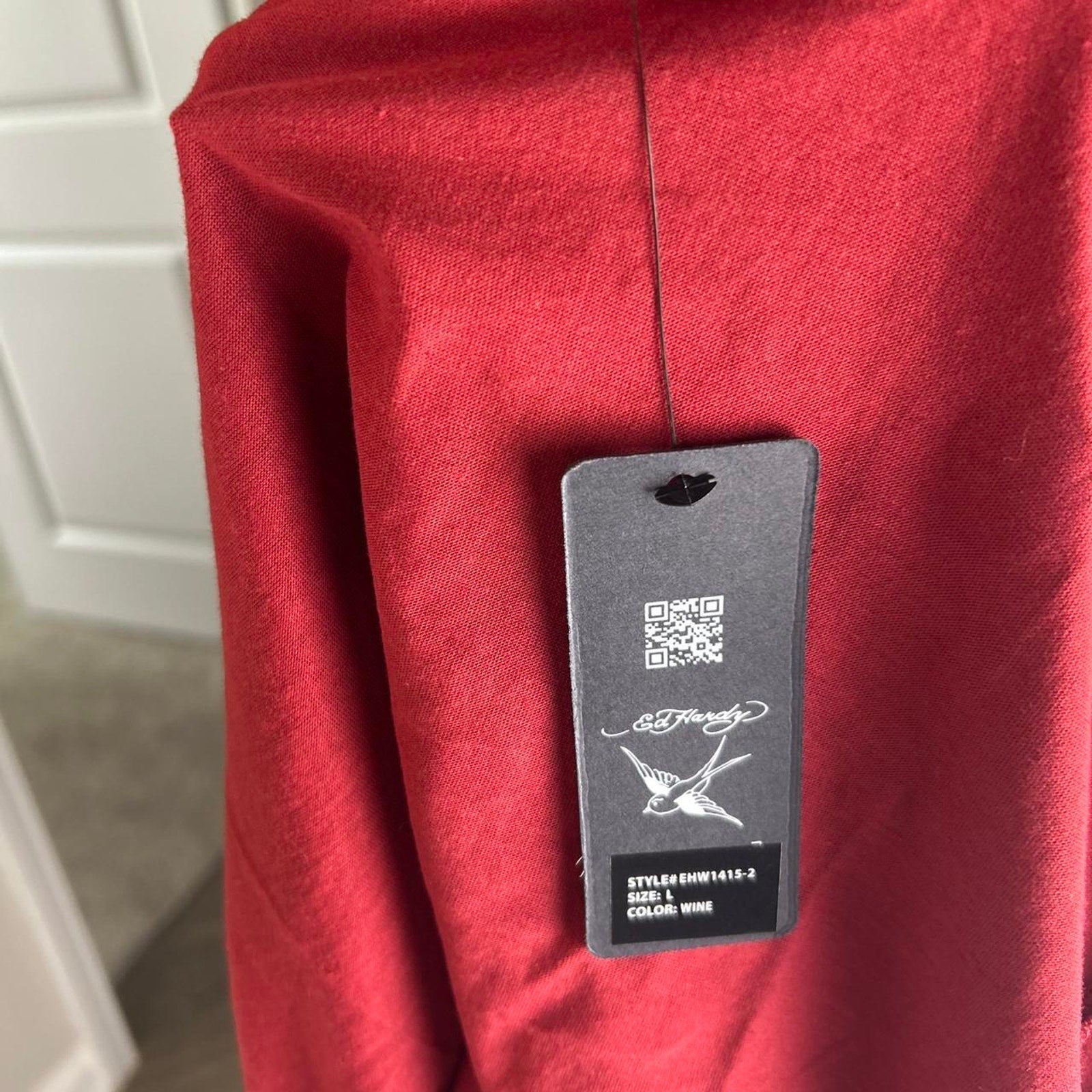 Ed Hardy red graphic tattoo tee with tiger design and "Runs Love Wild" slogan long sleeve mesh baby tee