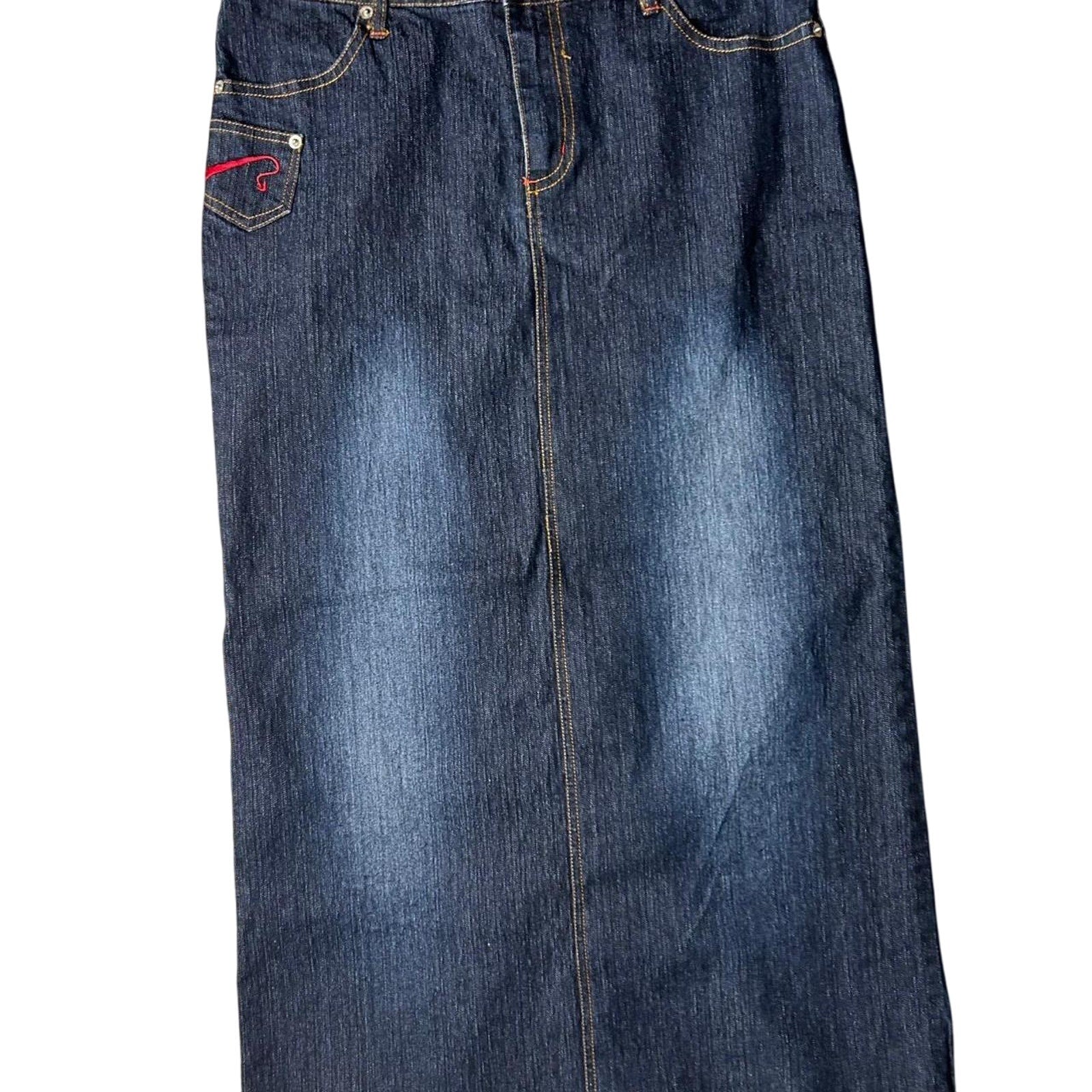 Goddess trend size 30x36 dark wash faded denim maxi skirt