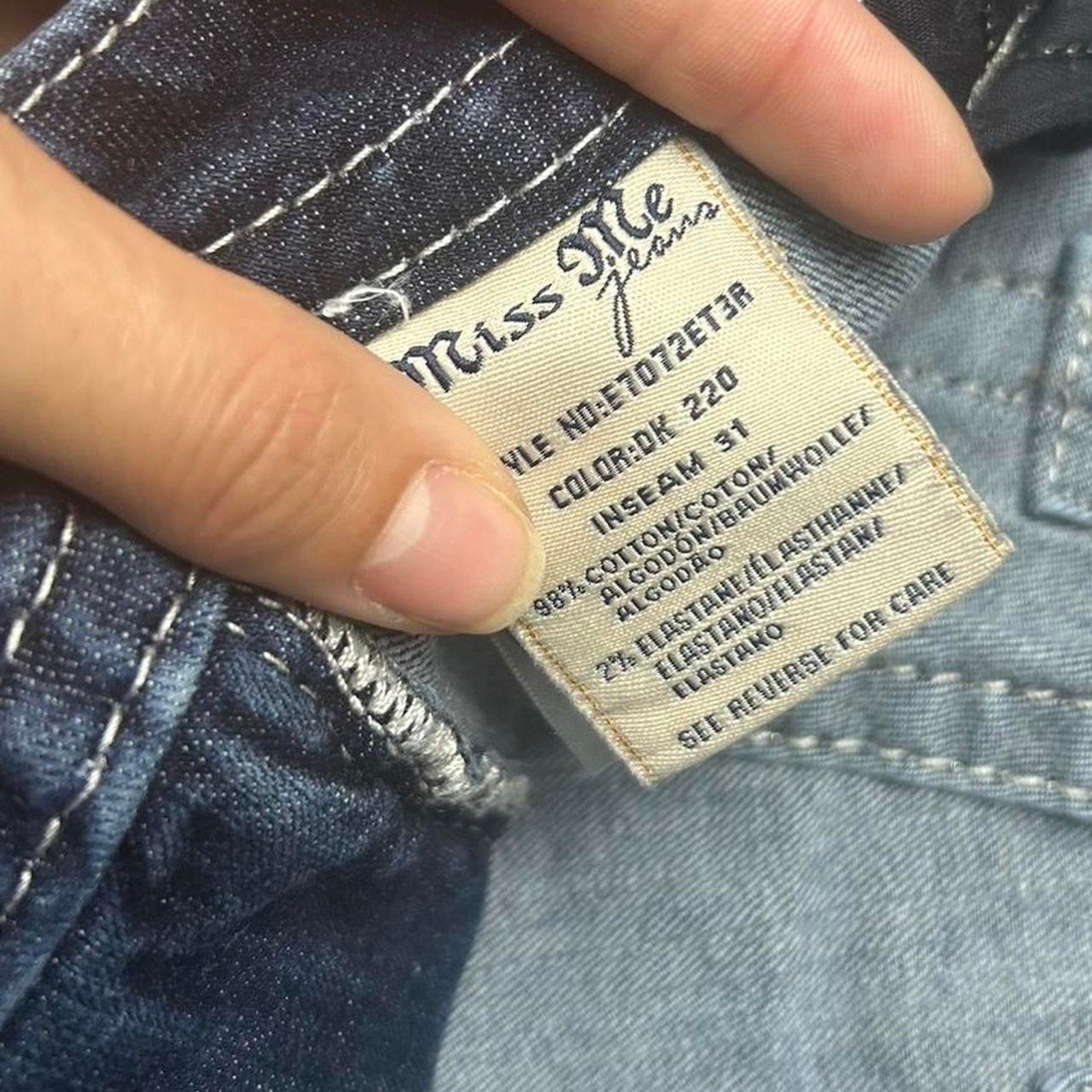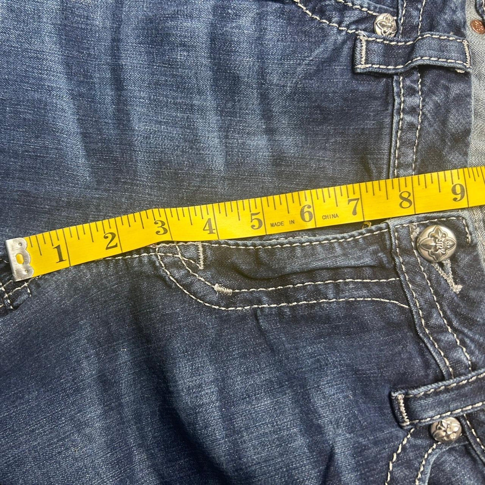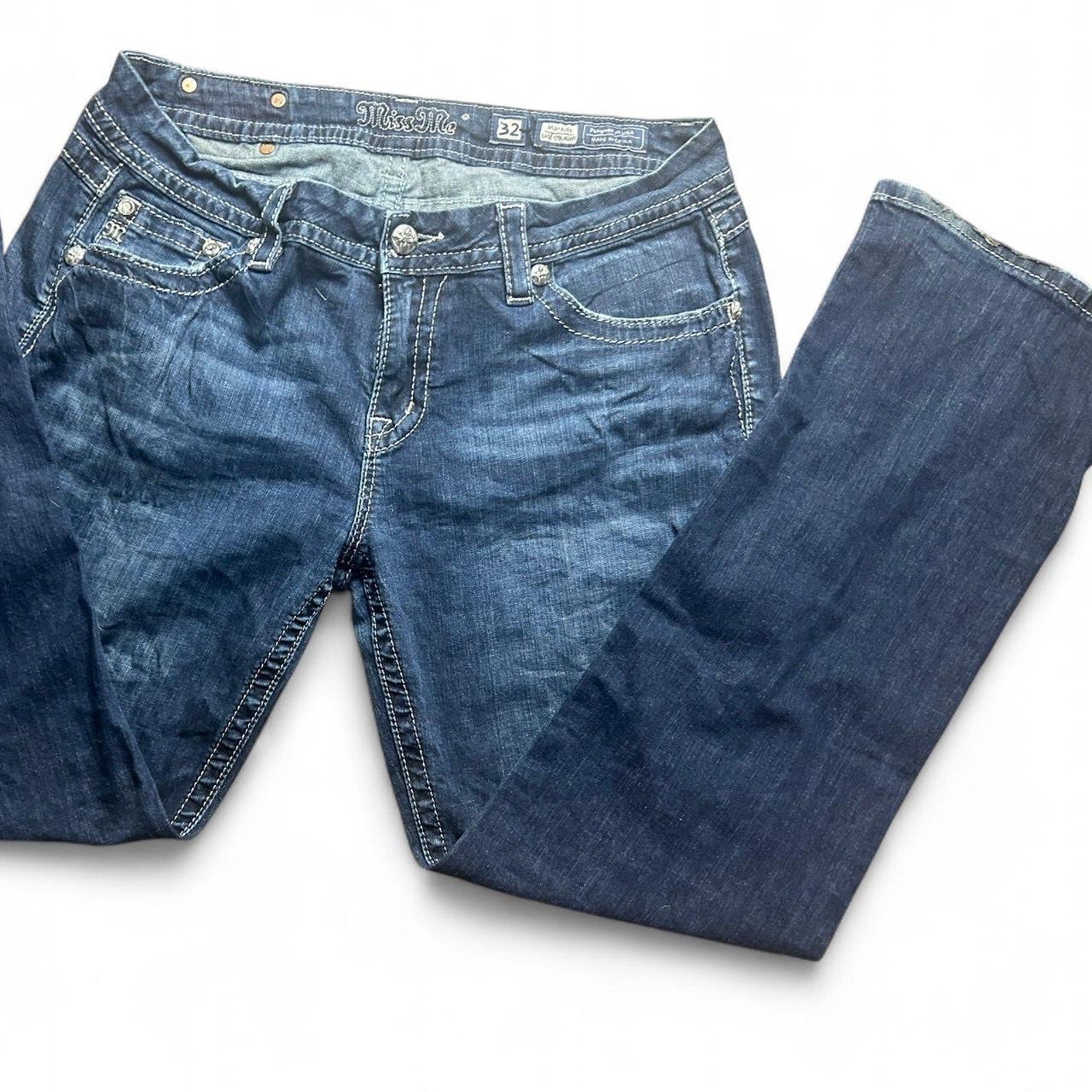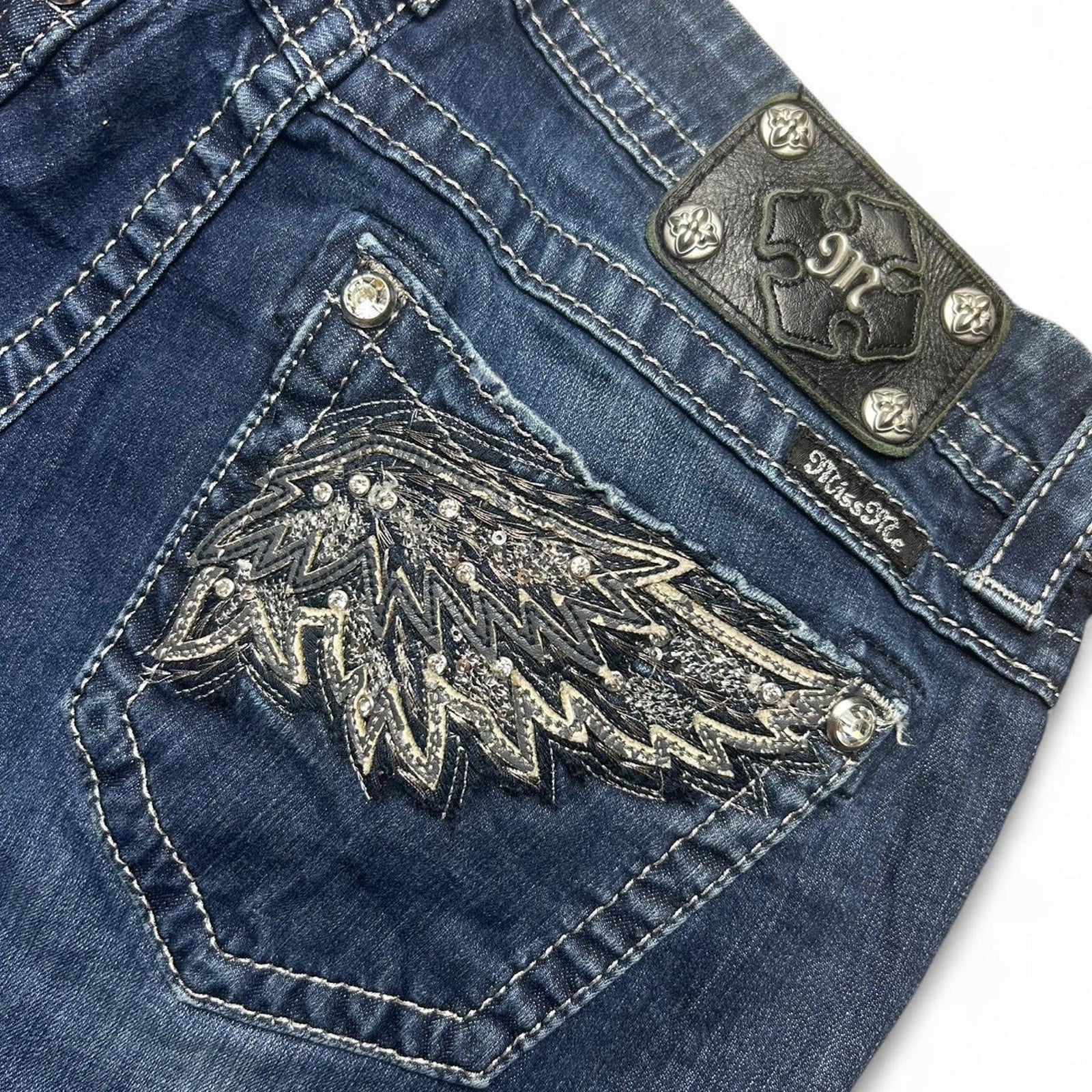 Miss Me midrise straight dark blue denim jeans with silver embroidered angel wings on back pockets