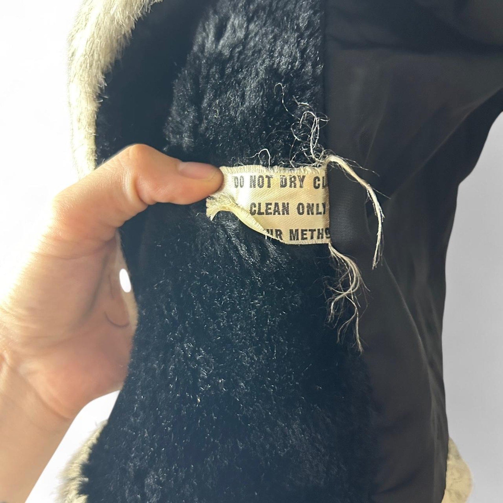 Penny lane Black and white vintage fur coat with faux fur lining, featuring a belted design fashion with gold locking closures and satin lining