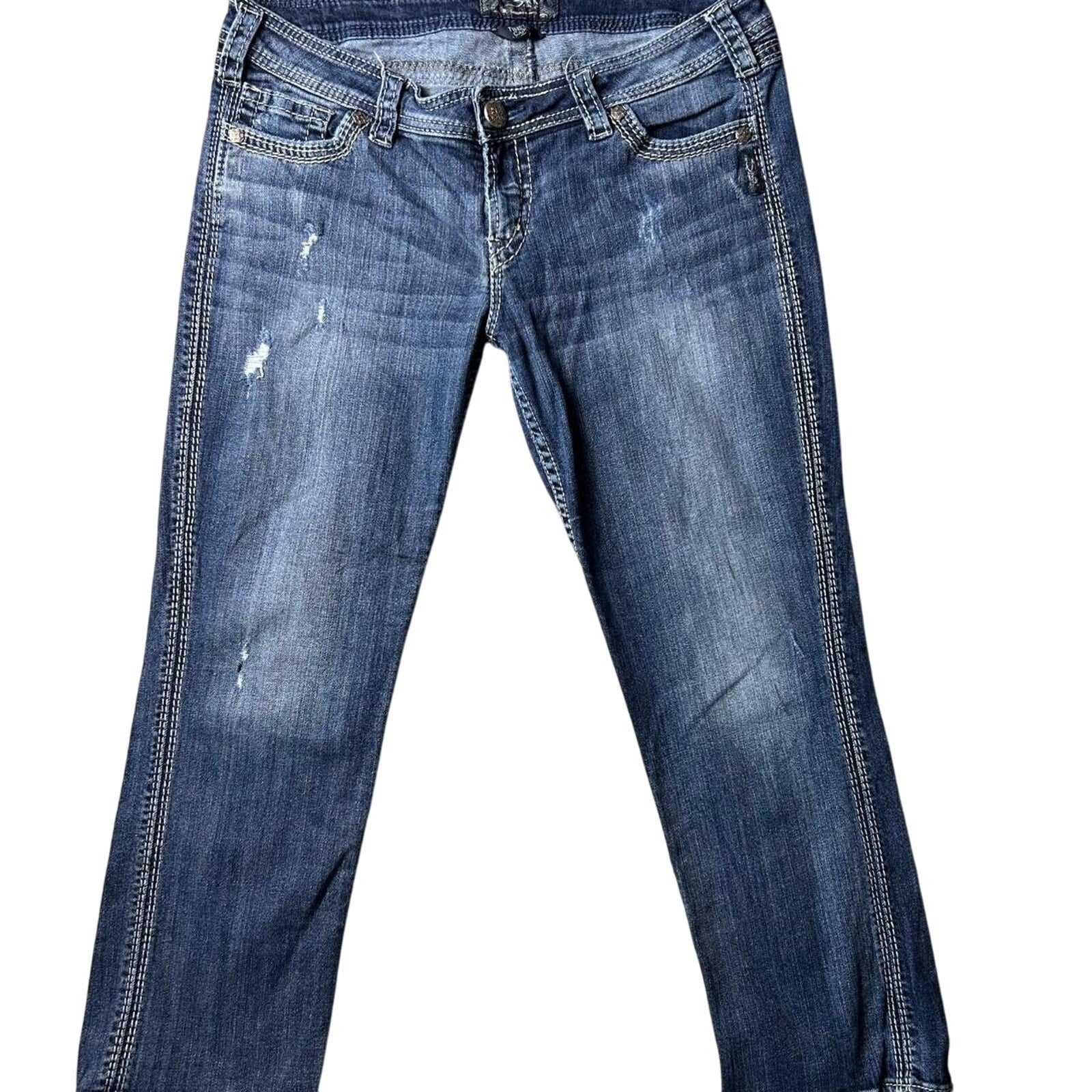 Silver size 32x26 Navy blue capri jeans with a distressed, faded look