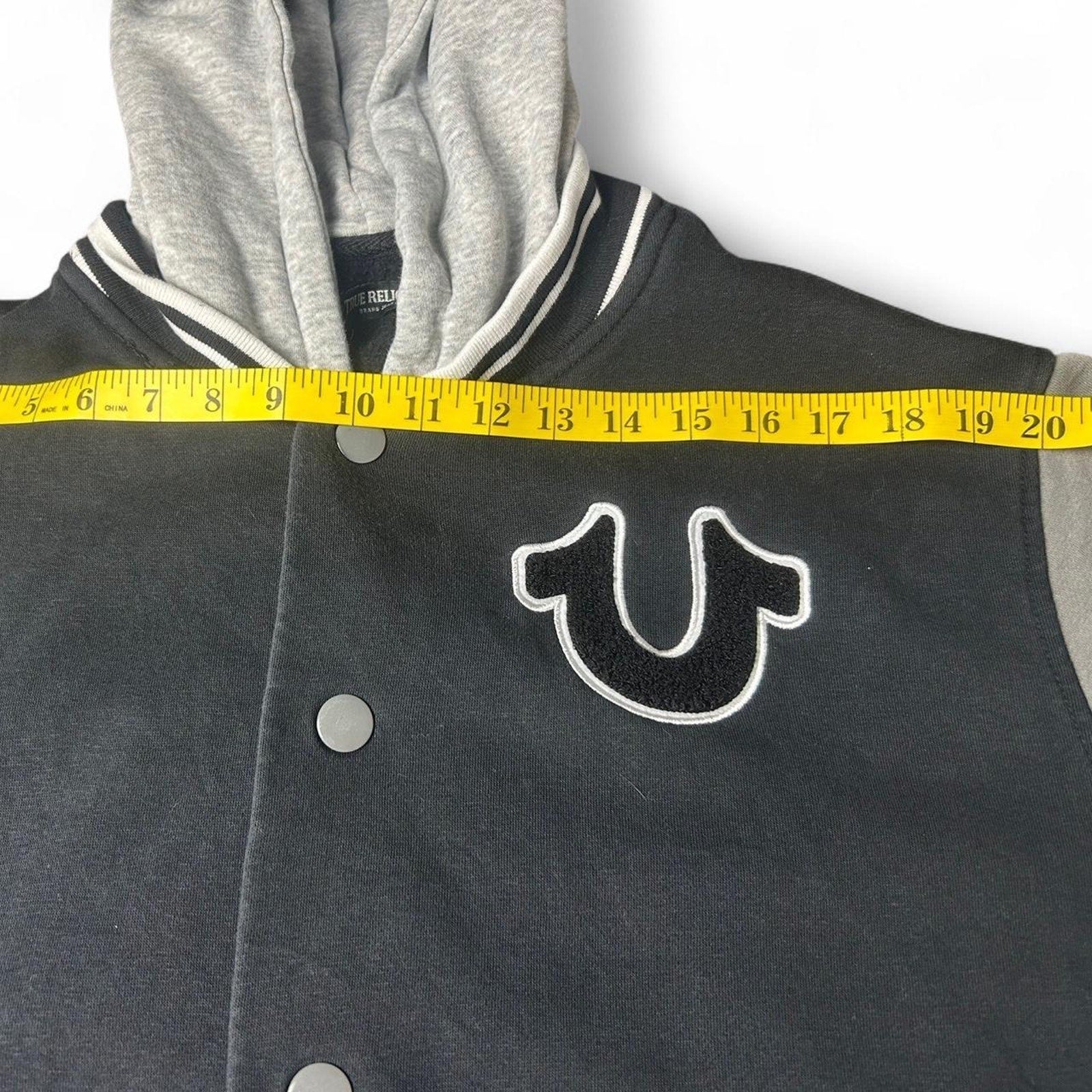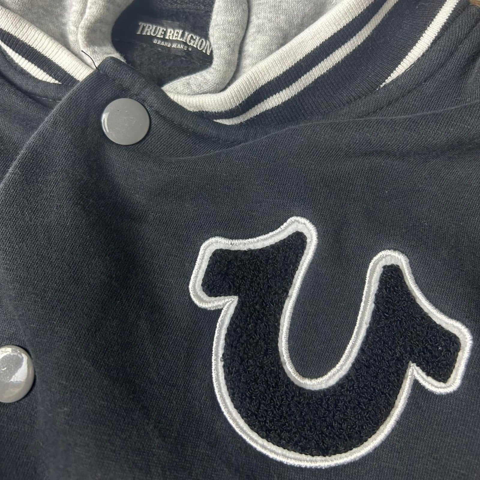 True Religion black and grey varsity jacket with a patch and contrasting stripe details